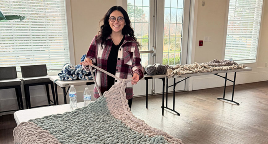 This ripple effect of kindness is reflected through our outStation events. This month, our Virginia Beach outStation hosted a civic engagement workshop where participants learned how to hand-knit blankets. Each participant left the workshop with additional supplies to continue their blankets at home. Within days, spouses shared photos of completed blankets and even stories of teaching their children the technique, creating memories that extended beyond the workshop itself.