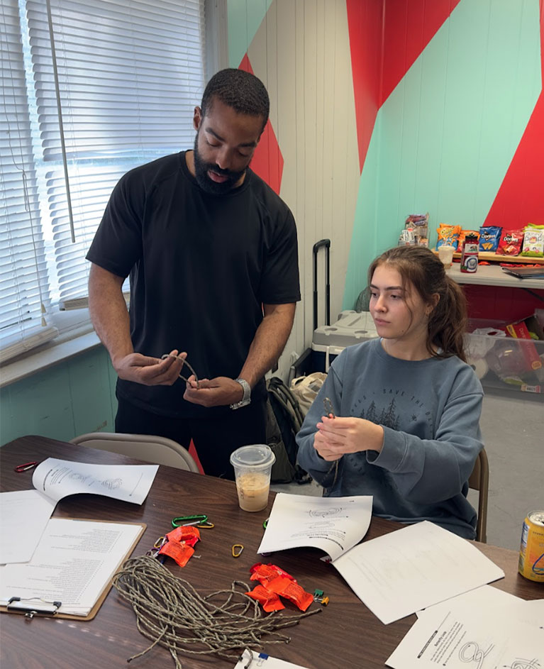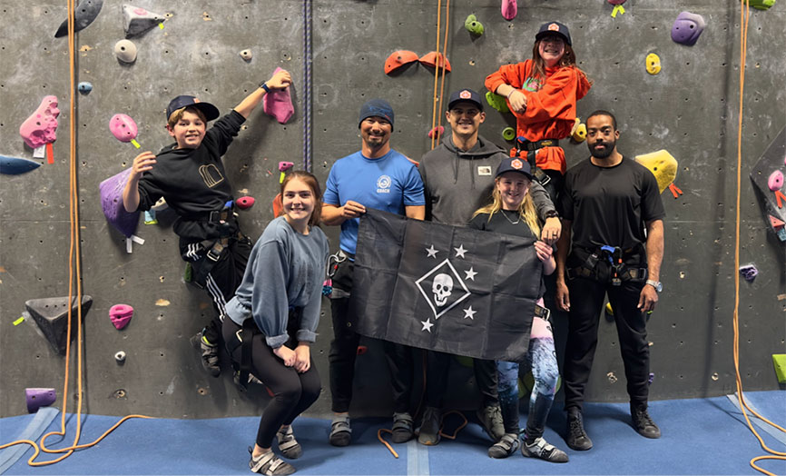 While The Crossing takes place in Montana every summer, outStation Camp Lejeune brought a piece of its curriculum to our Interwoven programming in North Carolina. In March, 4 Gold Star Sons and Daughters and 3 MARSOC Service Members participated in an indoor rock climbing event. MARSOC Service Members volunteered to proudly step into the role of mentors, guiding the children through a knot tying exercise. Mentors served as a source of strength and reassurance for the children as they tapped into courage to tackle their climb.